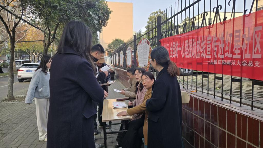 为普及心理健康知识,提升社区居民心理调适能力,推动社会心理服务体系建设,12月1日上午,民盟信阳师范大学总支组织盟员代表前往信阳市红星社区,开展了以“关爱心理健康,共建和谐社区”为主题的“12356全国统一心理援助热线”公益宣传活动。
