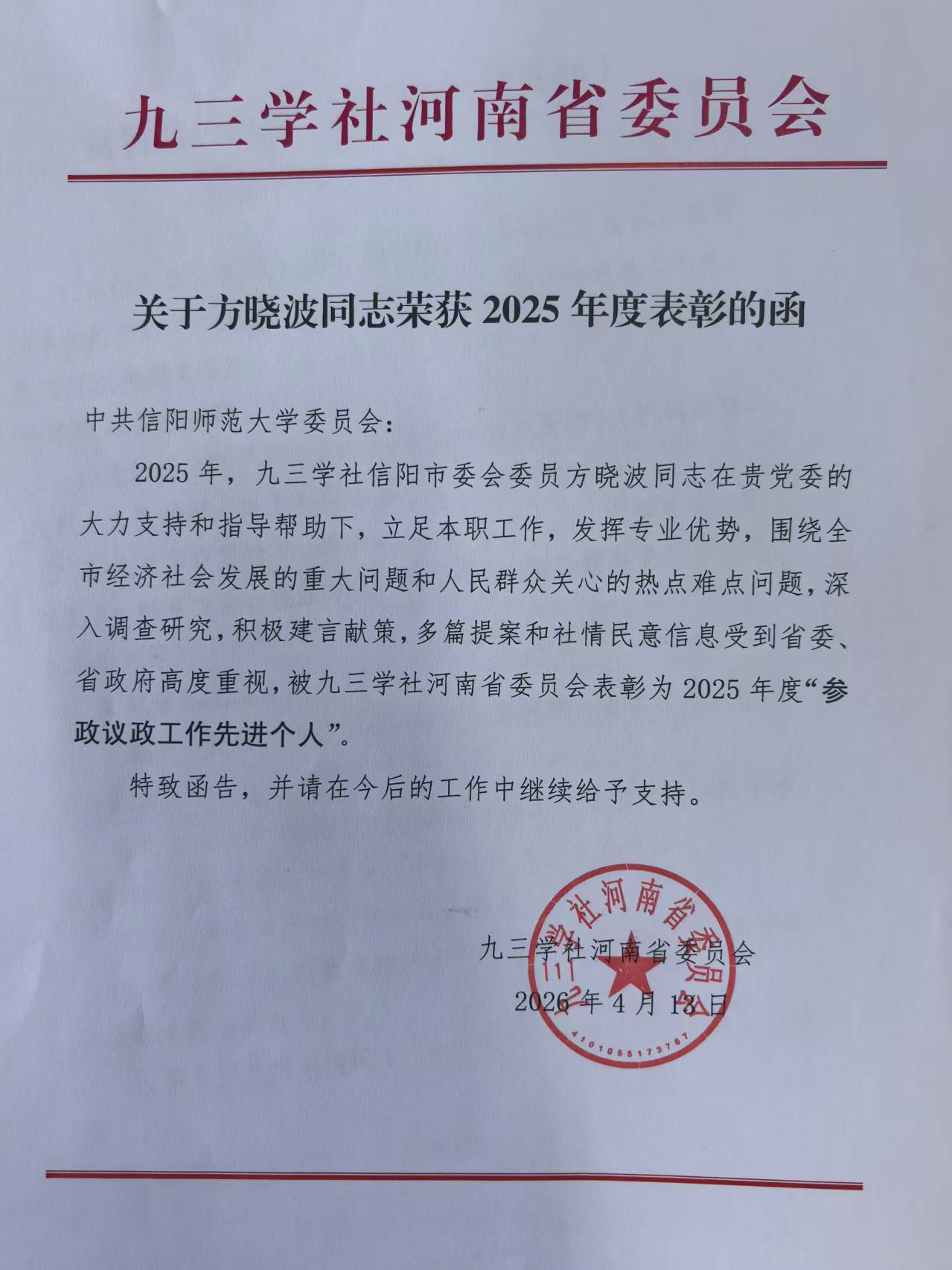 日前,九三学社河南省委员会发来表彰函,函告市政协委员、九三学社信阳市委会委员、我校商学院方晓波博士被九三学社河南省委会表彰为2025年度“参政议政工作先进个人”。